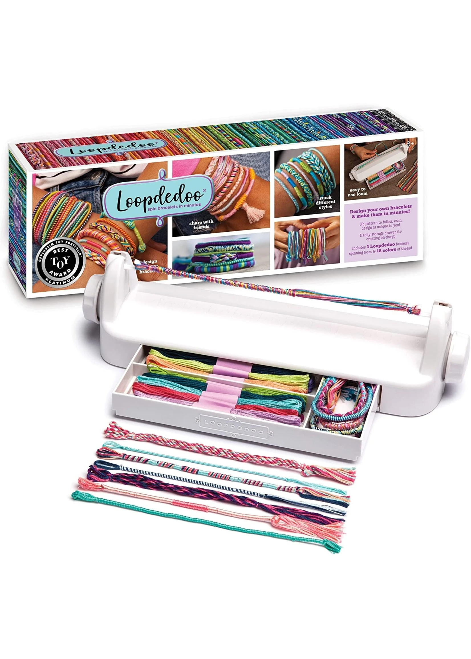 Loopdies are colorful accessories that you design with embroidery floss and spin with the Loopdedoo. It’s fast, easy and fun. You can make a friendship bracelet in just a few minutes. And you can make necklaces, anklets, belts and more.