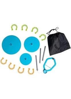 A topsy-turvy point-wranglin’ challenge! Players take turns tossing the rubbery horseshoes to try and ring them onto the suspended pole and platforms. Classic Horseshoes becomes perilously pendulous!