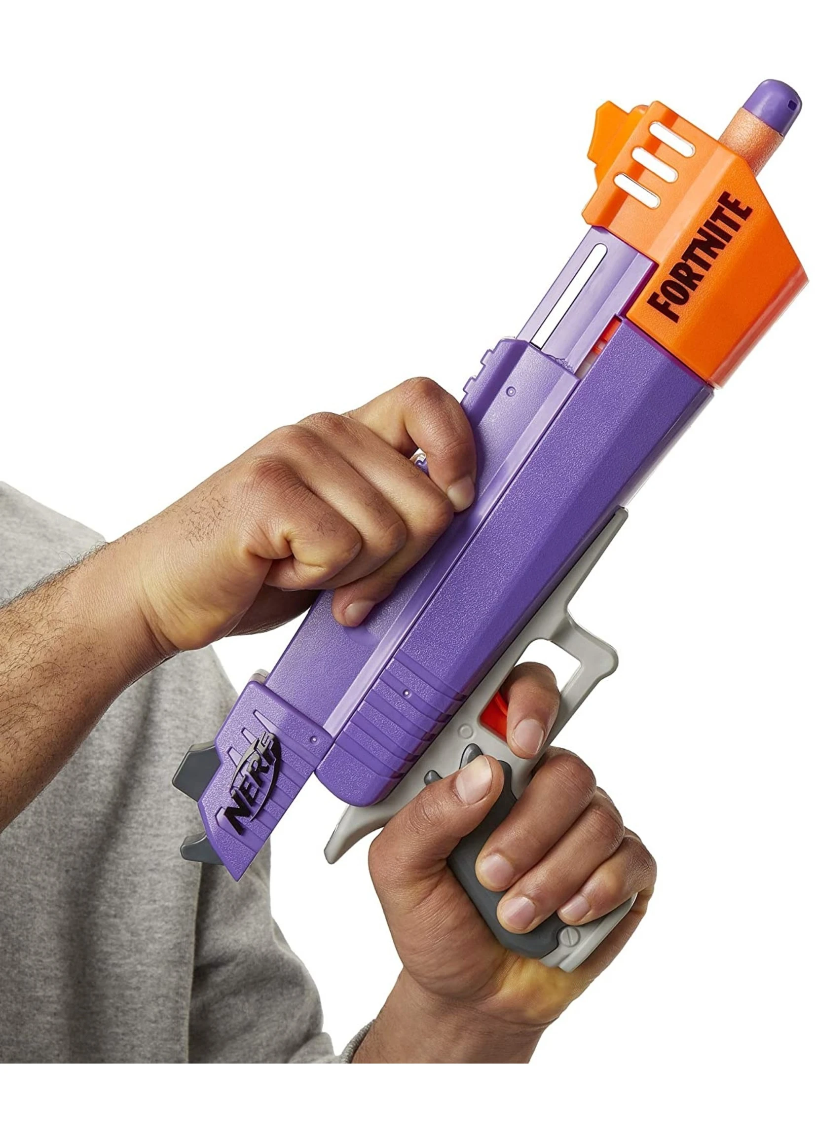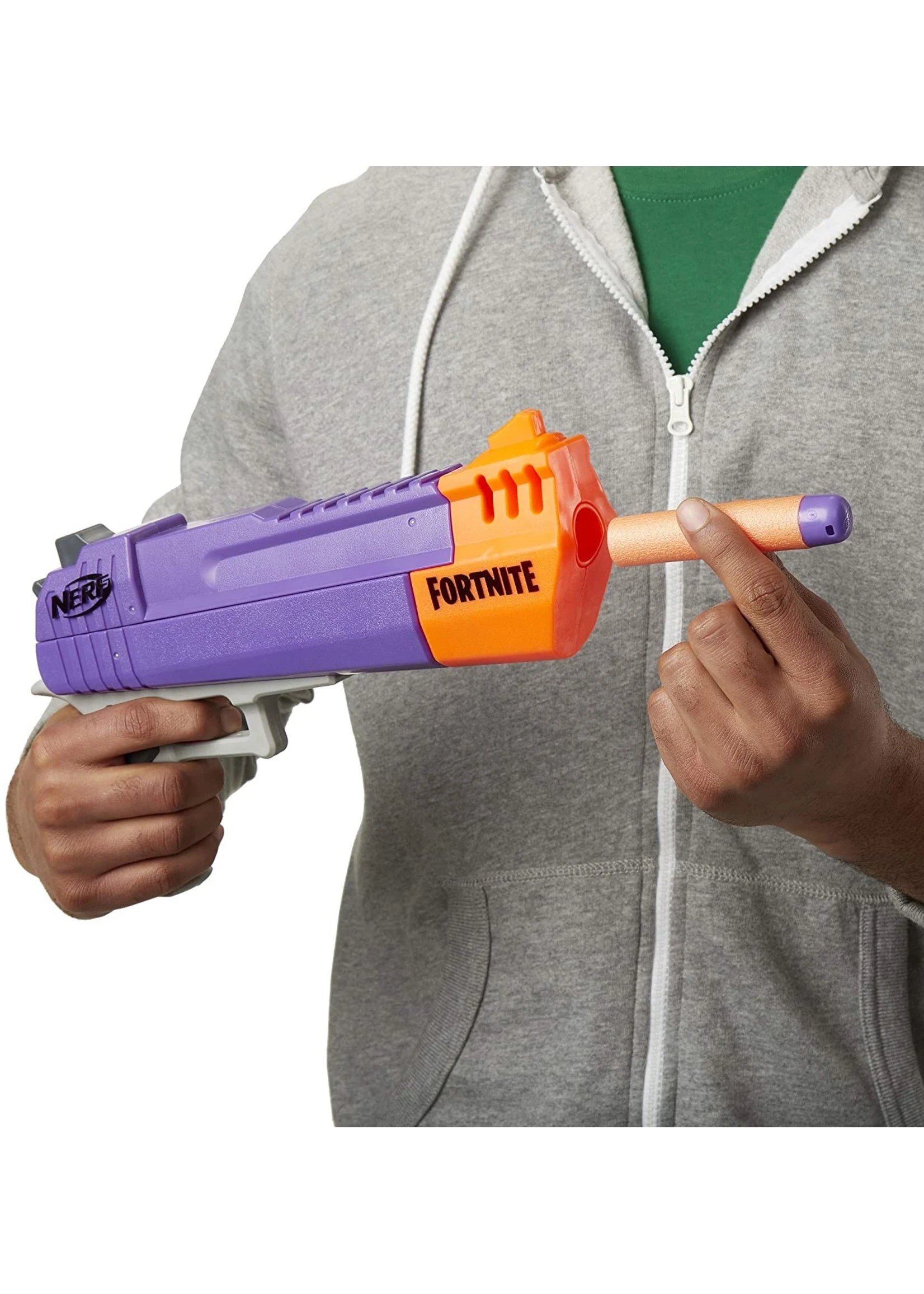 The Nerf Fortnite HC-E blaster is inspired by the blaster used in the Fortnite video game! Take your Fortnite battles into real life with this single-shot Nerf Mega blaster and storm into powerful dart blasting! Front-load 1 dart into the barrel, move the slide to prime, and pull the trigger to fire. It comes with 3 Official Nerf Mega darts. Official Nerf Darts are tested and approved for performance and quality and constructed of foam with flexible, hollow tips. Drop into indoor and outdoor Fortnite action with this dart-firing Nerf Mega Fortnite blaster! No batteries required.