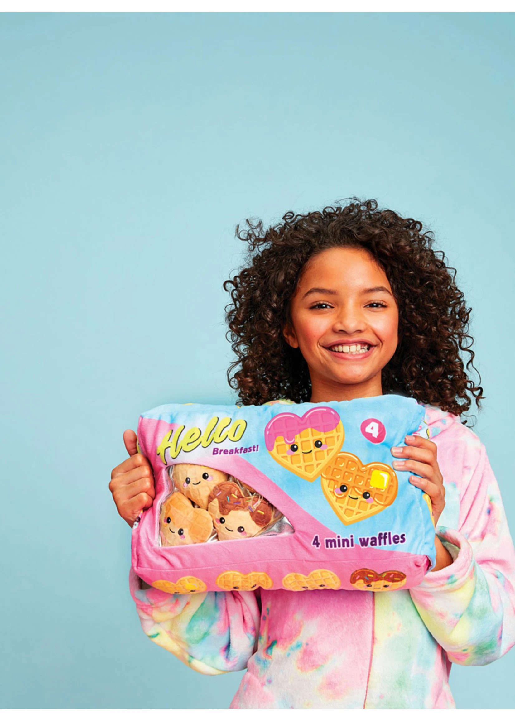 Is this a squishy soft plush, or an interactive pretend-play toy? It’s both! 4 mini, heart-shaped waffles with embroidered detailing fit cozily inside. Let’s play! Approximately 14x8x3″ in size.