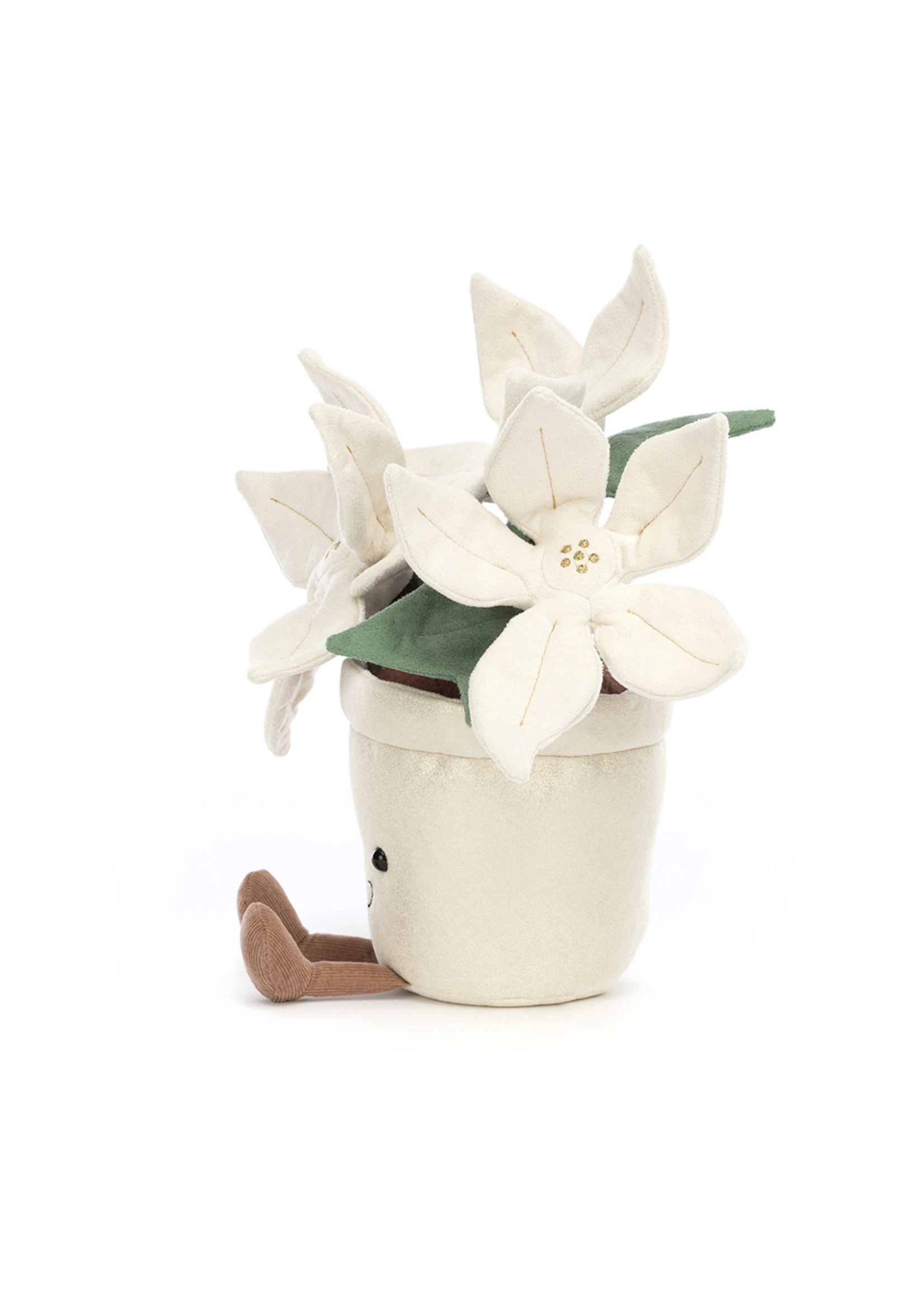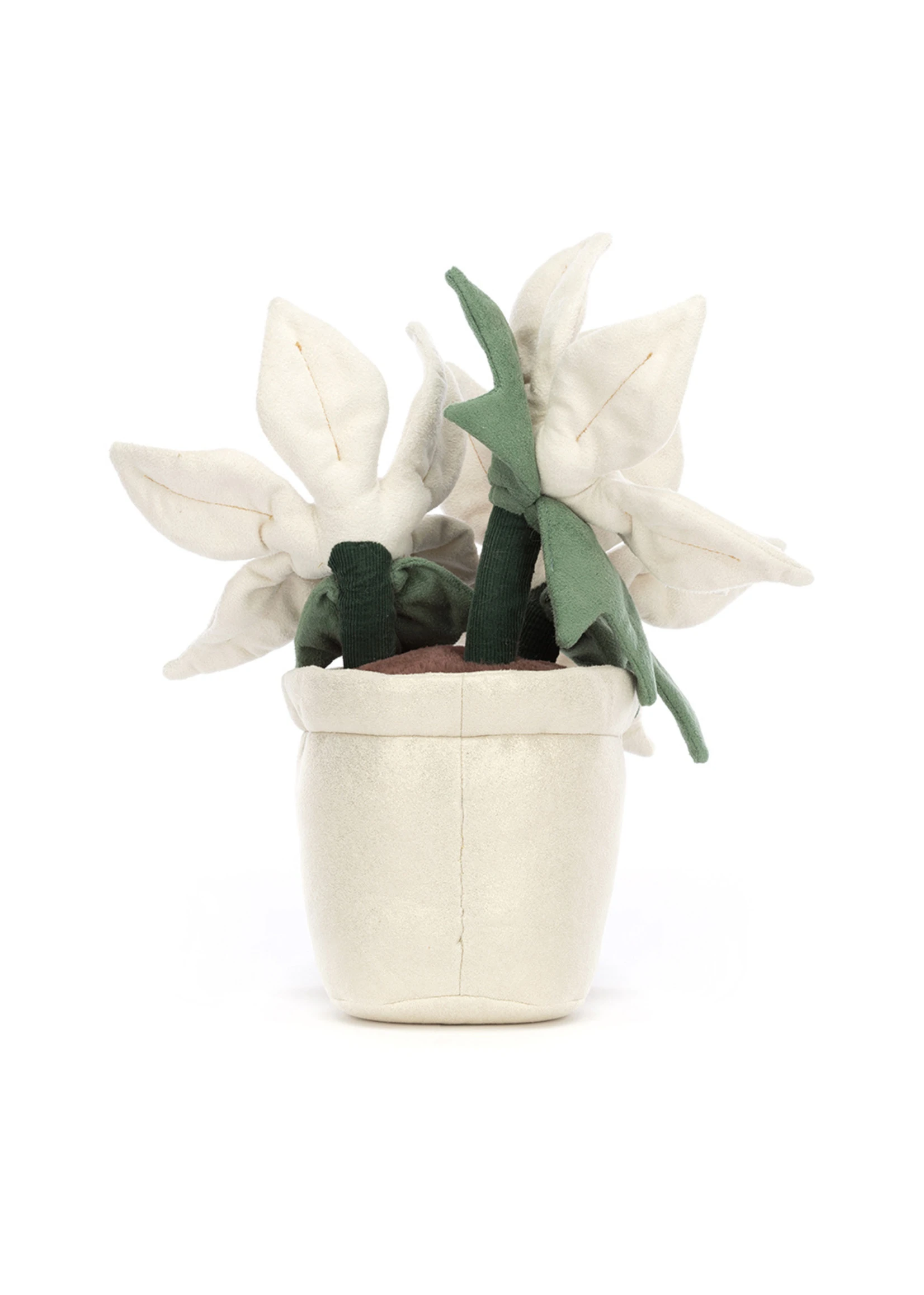 Amuseable Gold Poinsettia is looking very proud, and no wonder! Check out that crown of white-chocolate petals with suedey fur and spiffy gold stitching! With bluey-green leaves, a strong cordy stalk, a glittery pot and milk-chocolate cord boots, this little plant is pretty perfect!