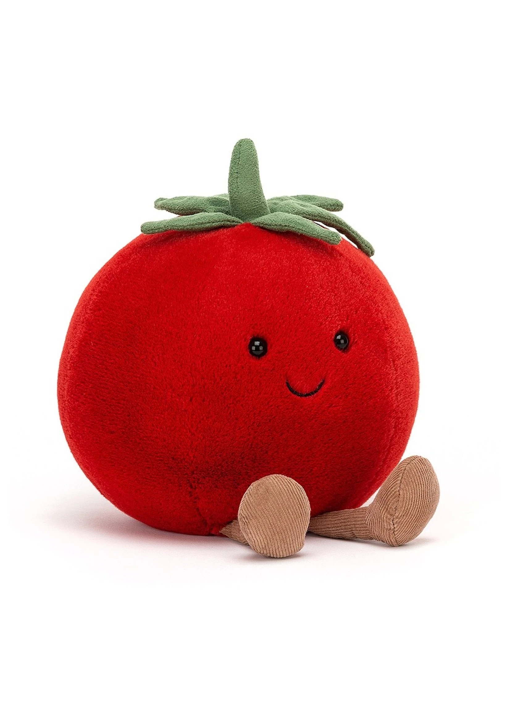Amuseable Tomato is one sun-ripened rogue! Rosy and plump as a cricket ball, topped with a scruffly, leafy cap, this bright red bounder in toffee cord booties is equally at home in the kitchen or the garden. Anywhere where there’s sunlight, in fact!