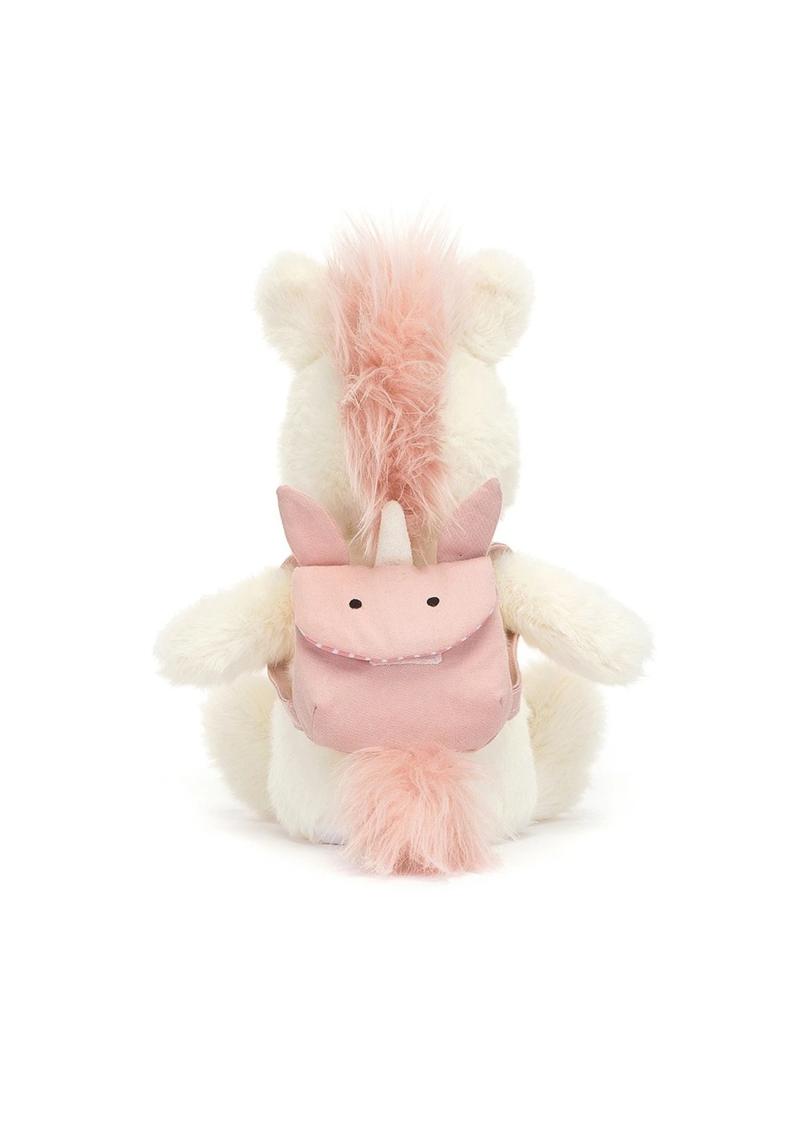 Backpack Unicorn is off on a quest! This brave little foal has tussle cream fur, a petal-pink mane and matching tail, and the sweetest suedey horn. Their unicorn backpack is fully lined and perfect for tiny supplies! With tufty ears, supersoft hooves and big bright eyes, this is one magical rambler!
