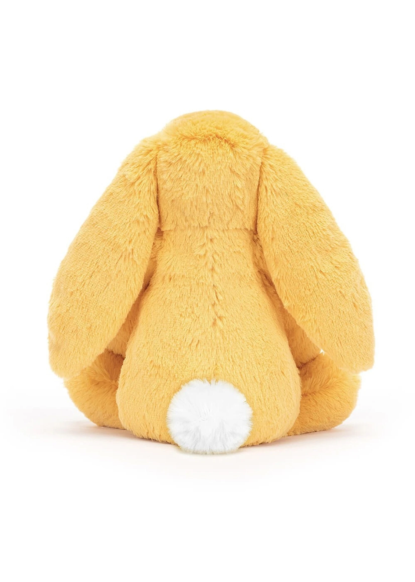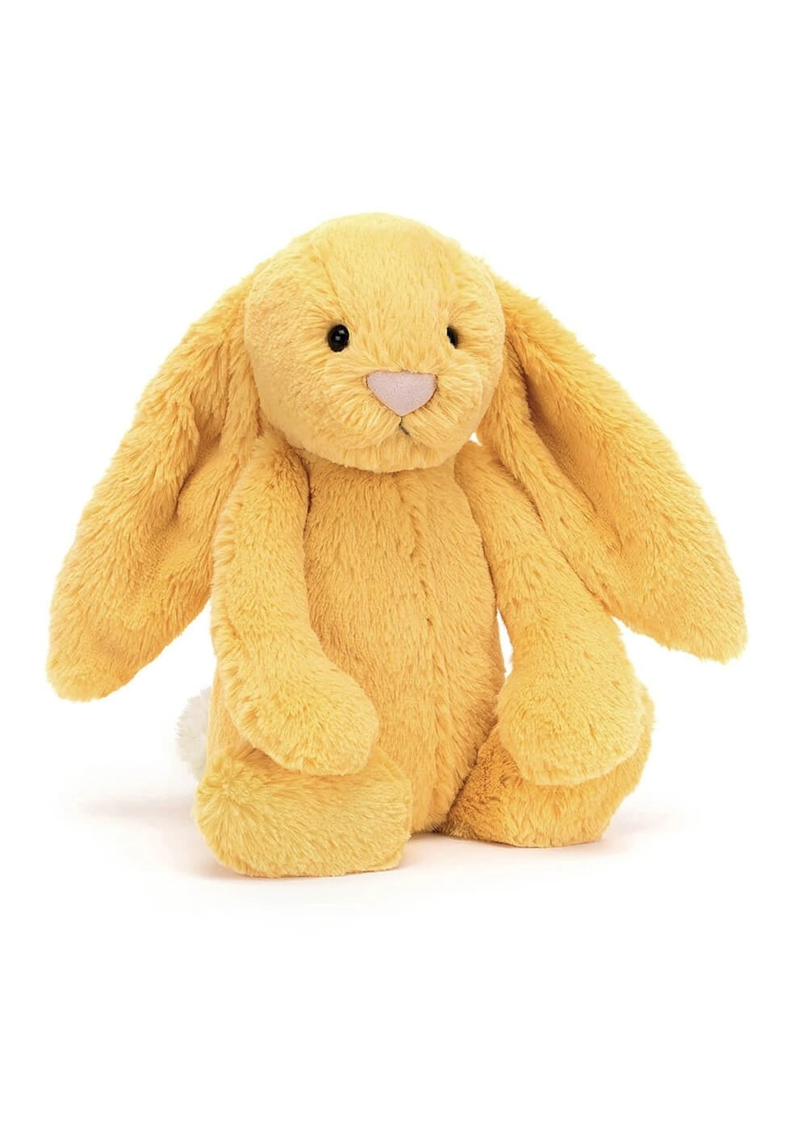 Banishing gloom in every room, it’s Bashful Sunshine Bunny! Gorgeously golden in custard yellow, this scrummy-soft scamp is so, so snuggly. Tickle those lovely lopsy ears, boop that pink nose and flop together on warm, lazy days. Everyone needs a boost of brightness!