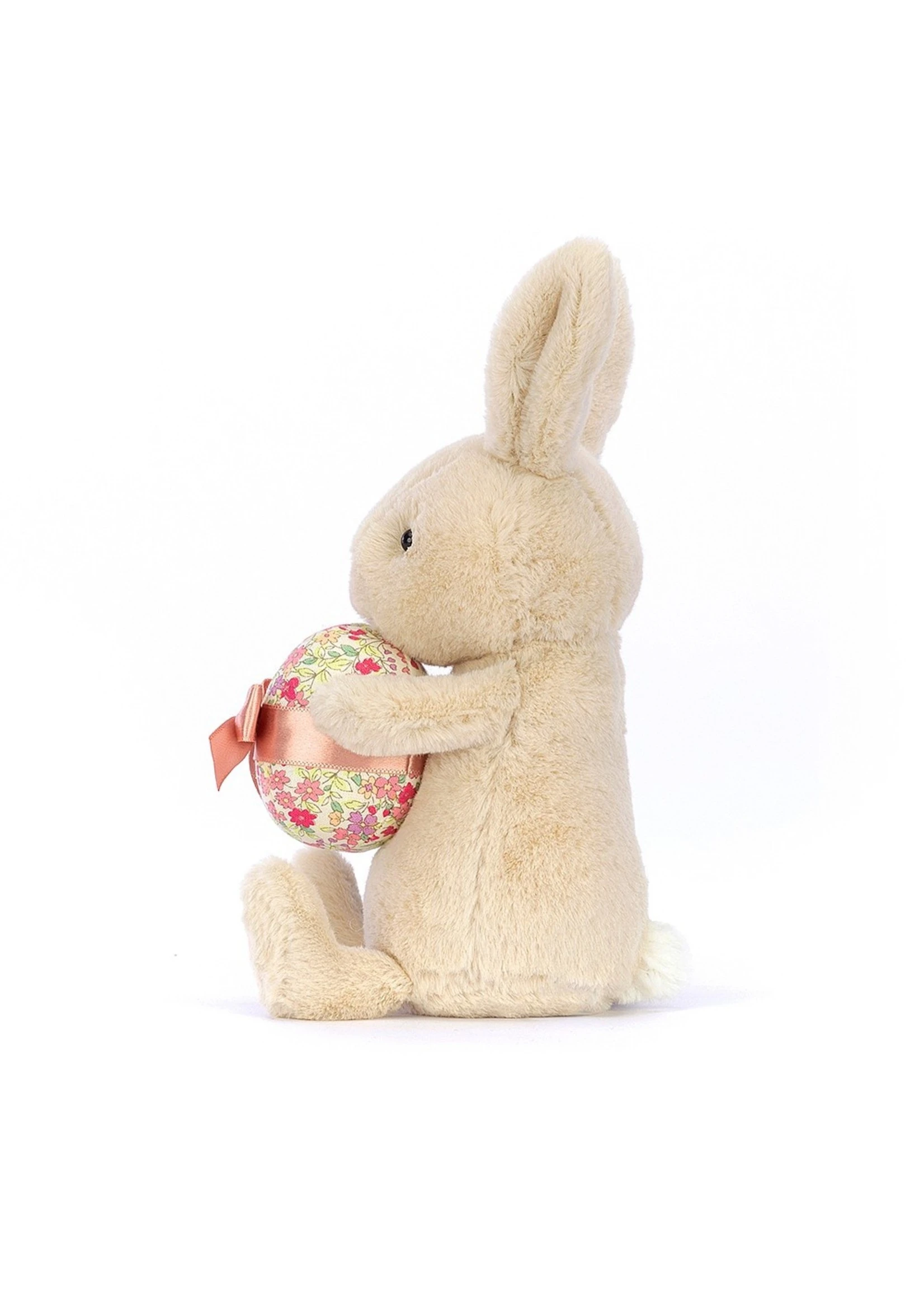 Here to share a scrumptious present, it’s Bonnie Bunny with Egg! This sweet perky bunny has been hunting round the garden to find the cheeriest ditsy-print egg! All wrapped up in a peach satin ribbon, it’s a gift for a very good friend! Celebrate springtime with this funny bunny.