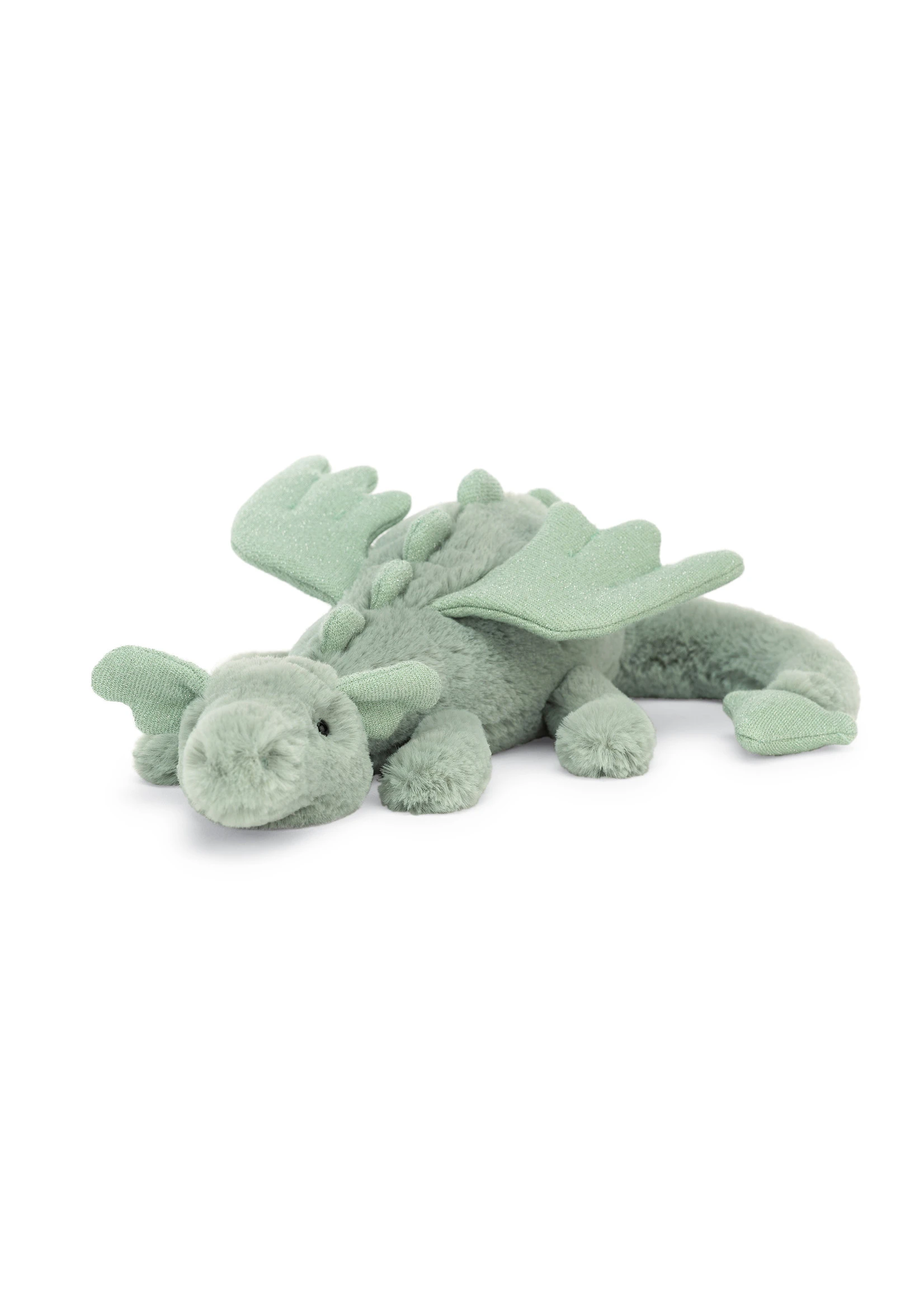 Doze and dream with sweet Sage Dragon. A curious cutie with waggle wings and minty-marvellous sparkle fur, this little legend has perky ears, squashy spines and a long, loopy tail. Dragons love stories, especially at bedtime, so spin some magical yarns!