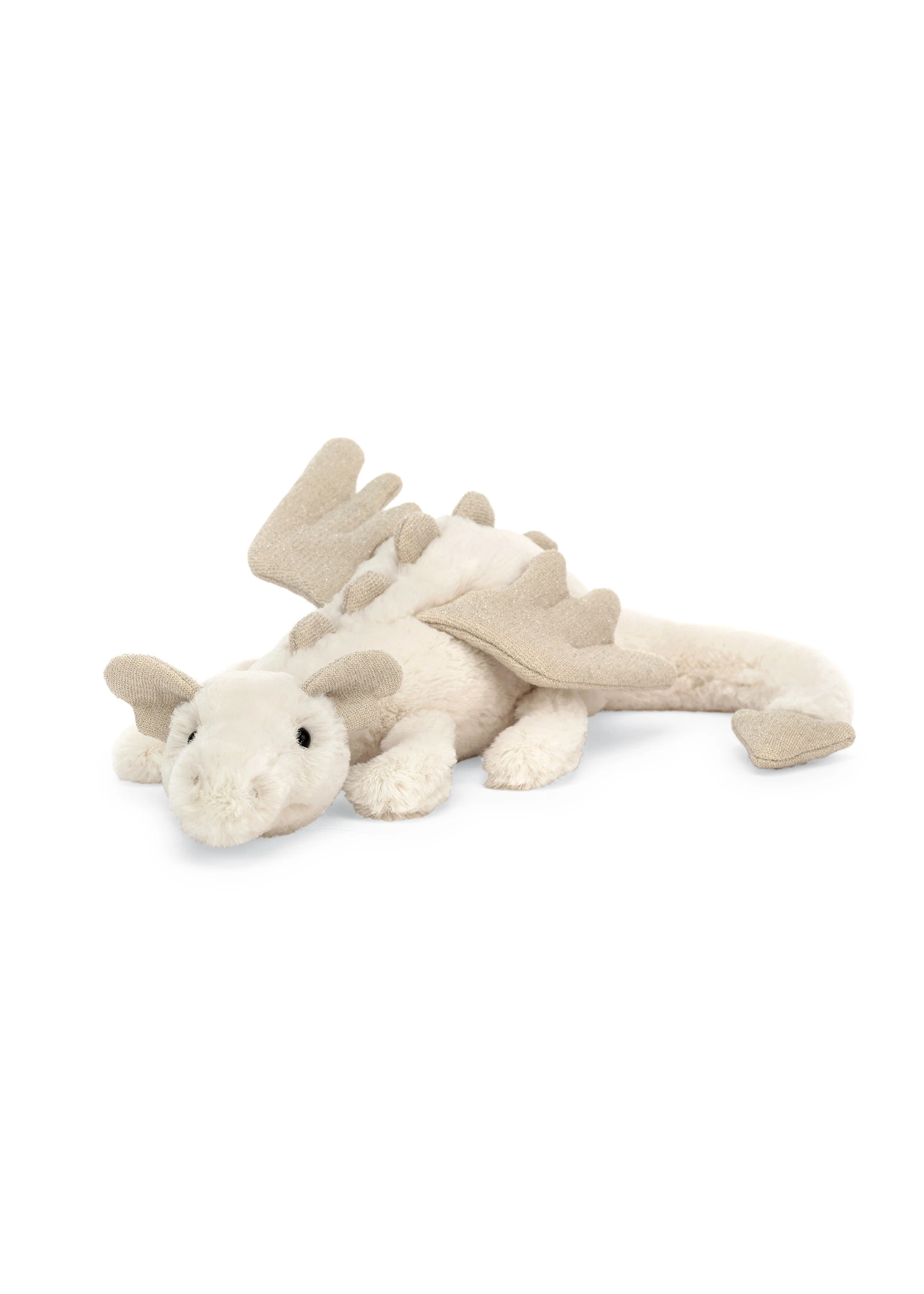 Lounging around like a creamy cloud, it’s loveably lazy Snow Dragon! This marshmallow marvel shimmers with magic, from sparkling spines to ears, wings and tail dart! This sumptuous softy loves flapping up a blizzard!