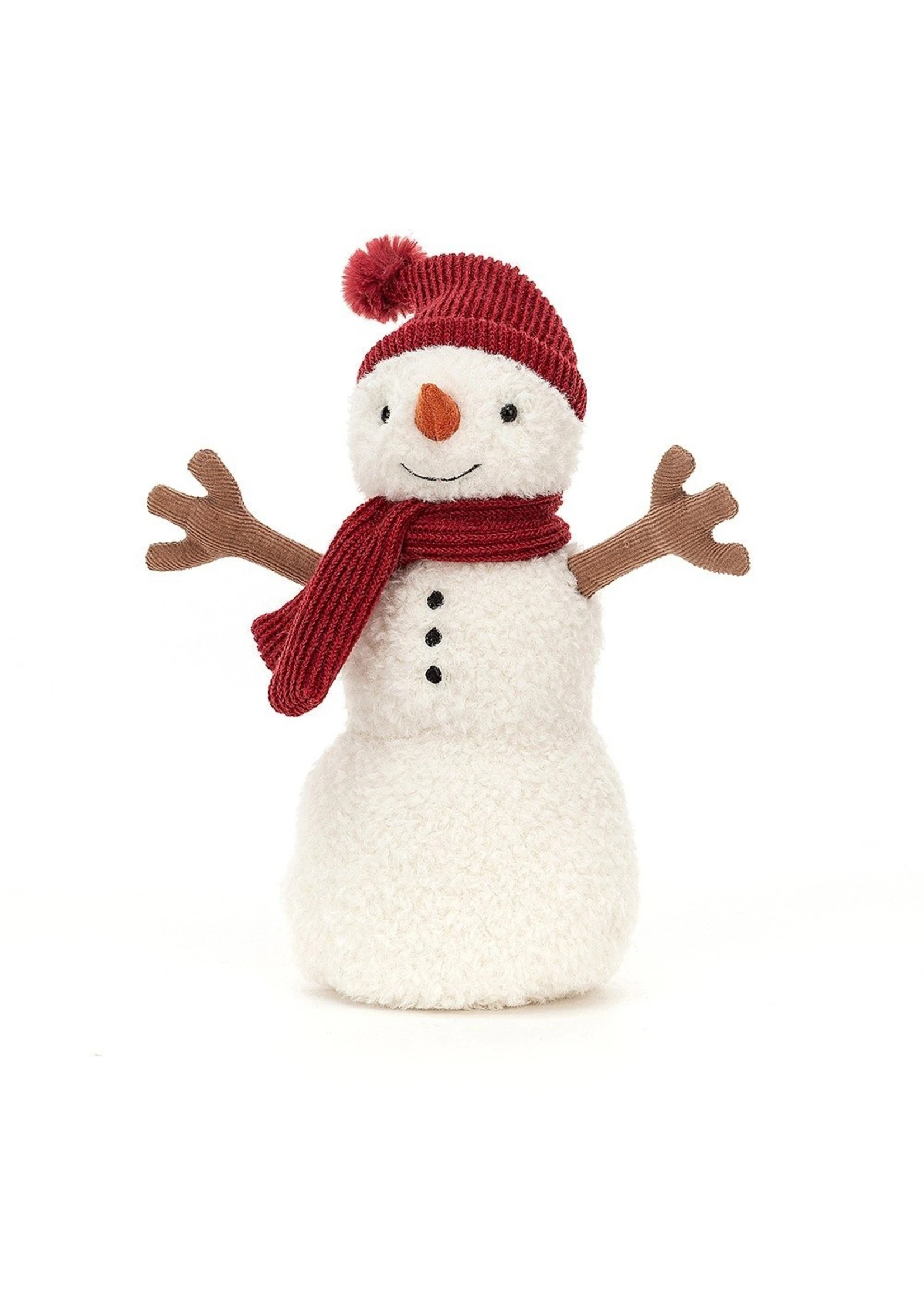 Chilly but cheery, Teddy Snowman is looking delightfully dapper. This fluffy cream snowman is looking pretty cool, with cordy stick arms, a suedey carrot nose and a rich red bobble hat and scarf. With three stitch buttons and a playful smile, Teddy is ready to roll.