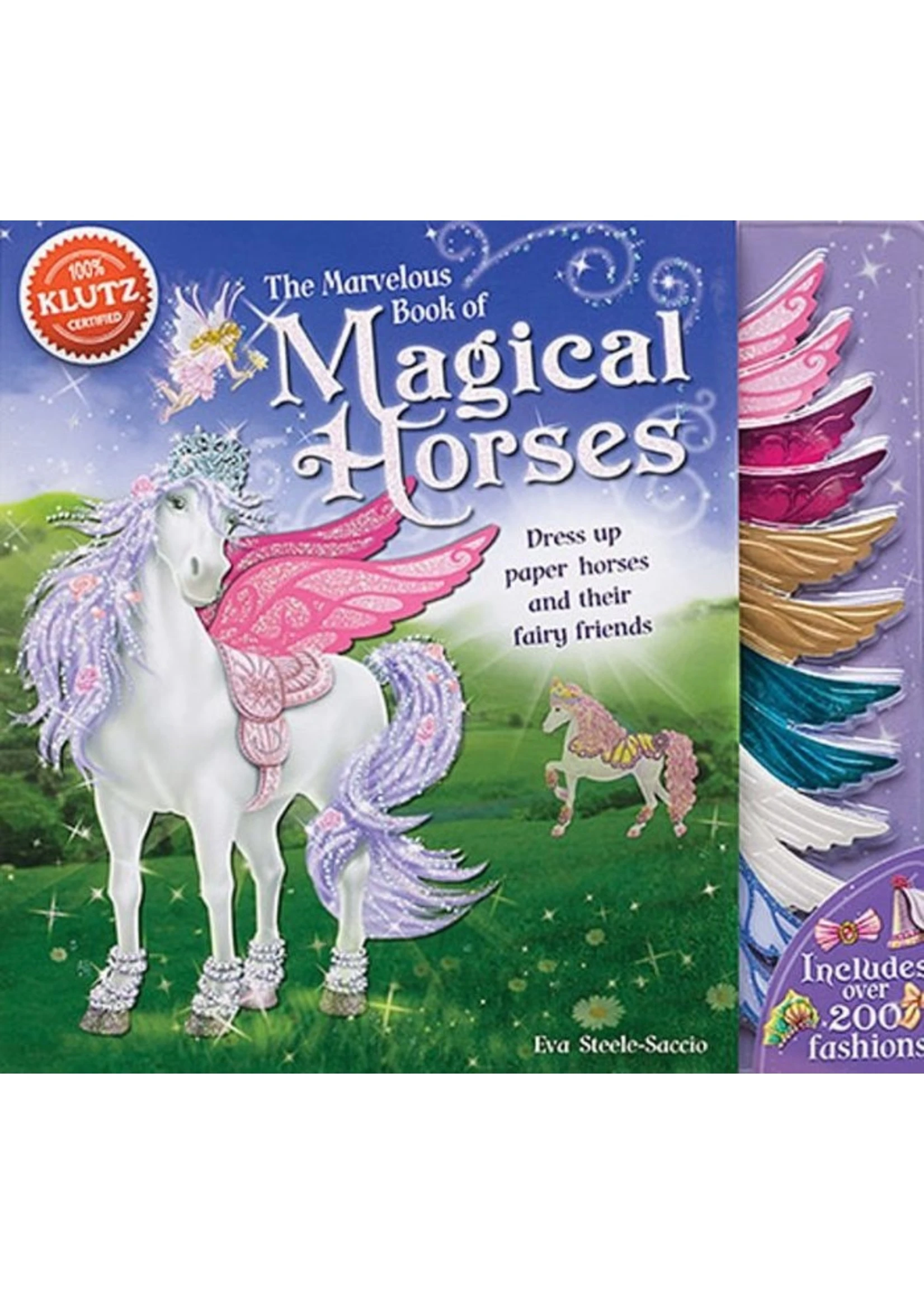Let your imagination take you somewhere enchanting. The Marvelous Book of Magical Horses comes with six gorgeous paper ponies and three paper-doll fairies. You get everything you need to dress them up and play: a dozen fabulous wings, more than 200 punch-out saddles, manes, bows, and other horse and fairy fashions, and four fabulously illustrated playscapes. Whether your favorite flying horse soars across the night sky or wears a crystal unicorn horn, the result is truly magical.
