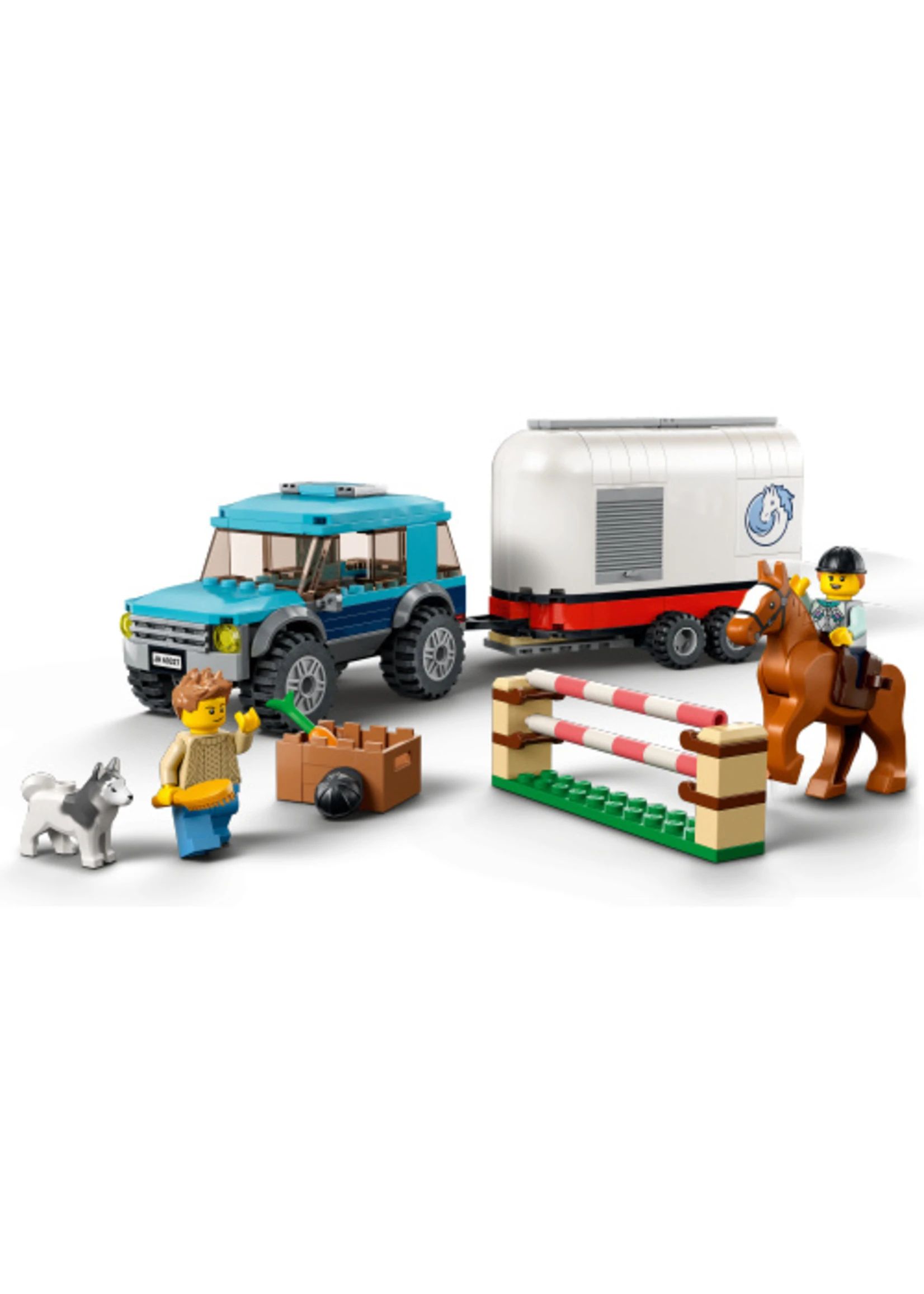 - What’s in the box? – Everything kids need to build a toy SUV, horse trailer and horse-jumping fence, plus 2 minifigures, a horse figure and a dog figure