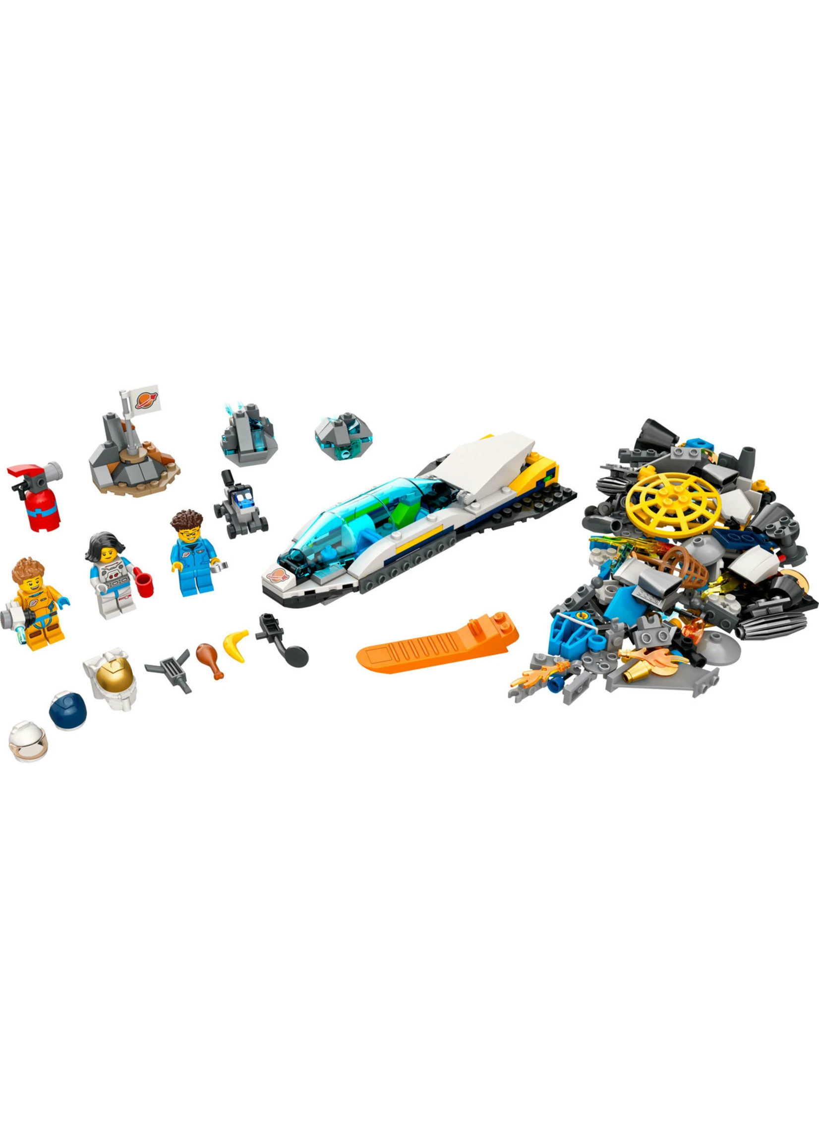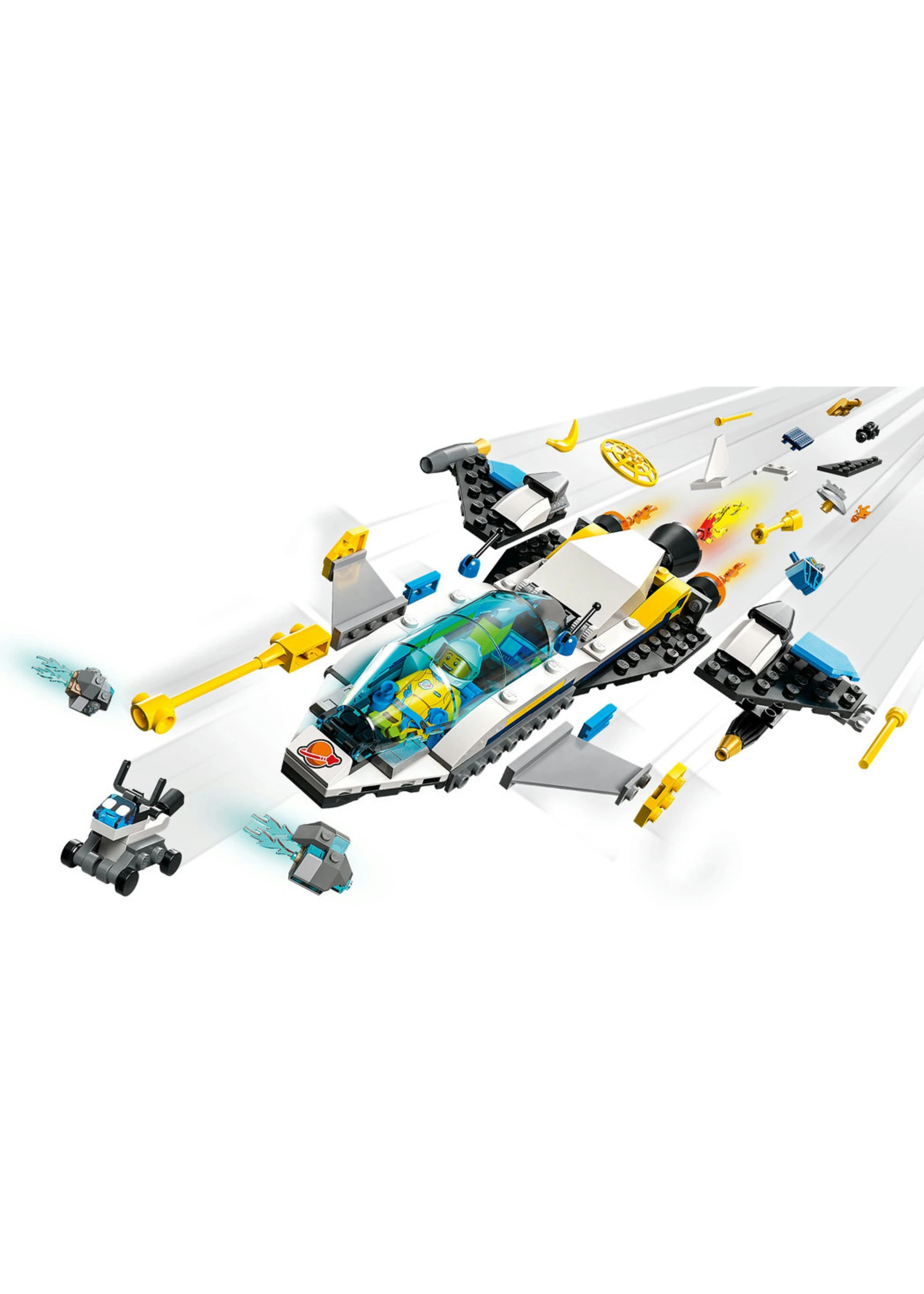 - What’s in the box? – All the LEGO® pieces kids need to build a mission spacecraft and solve instruction-free building challenges, plus 2 asteroids, a Mars setting, 3 minifigures and a robo-dog figure
