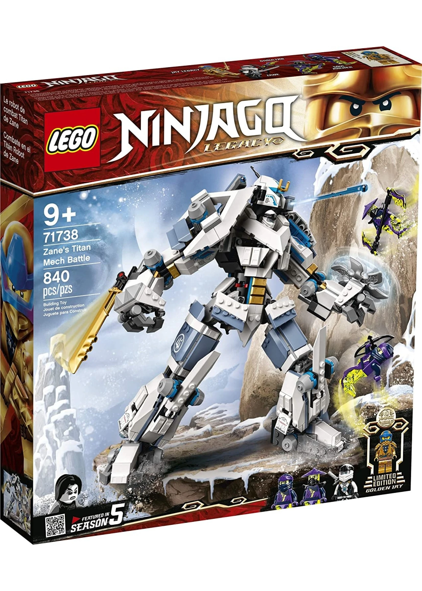 Get young ninja fans role-playing exciting scenes from season 5 of the LEGO NINJAGO TV series, with this Zane’s Titan Mech Battle (71738) Legacy set. Featuring posable legs and arms, a sword and spinning chainsaw in its hands, plus 2 spring-loaded shooters and a cockpit for ninja minifigures, kids will love this modern update of the original mech. This ninja toy features 4 minifigures: ninjas Zane and Jay Legacy plus 2 Ghost Warriors Ghoultar and Soul Archer, all armed with cool weapons including a bow and arrow and scythe to inspire endless NINJAGO battling fun. Jay Legacy is a special golden collectible minifigure to celebrate 10 years of NINJAGO toys. NINJAGO building toys open up a world of exciting adventures for kids. Little ninjas can team up with their heroes to battle a cast of evil villains as they role-play with an amazing collection of cool toys including dragons, mechs and temples.Â
