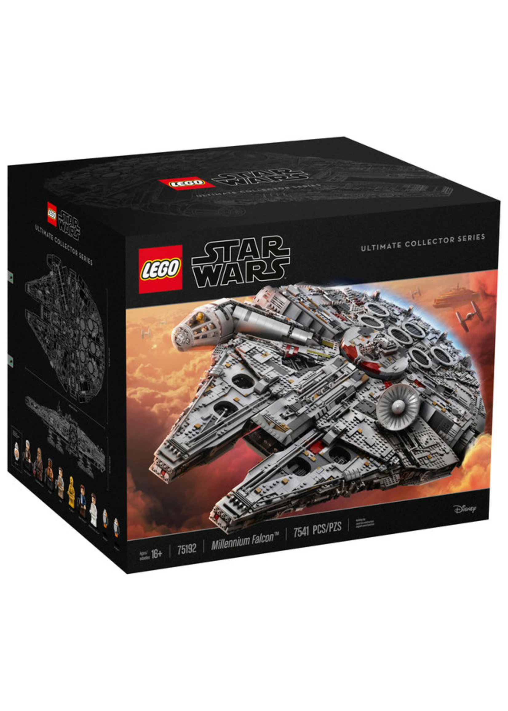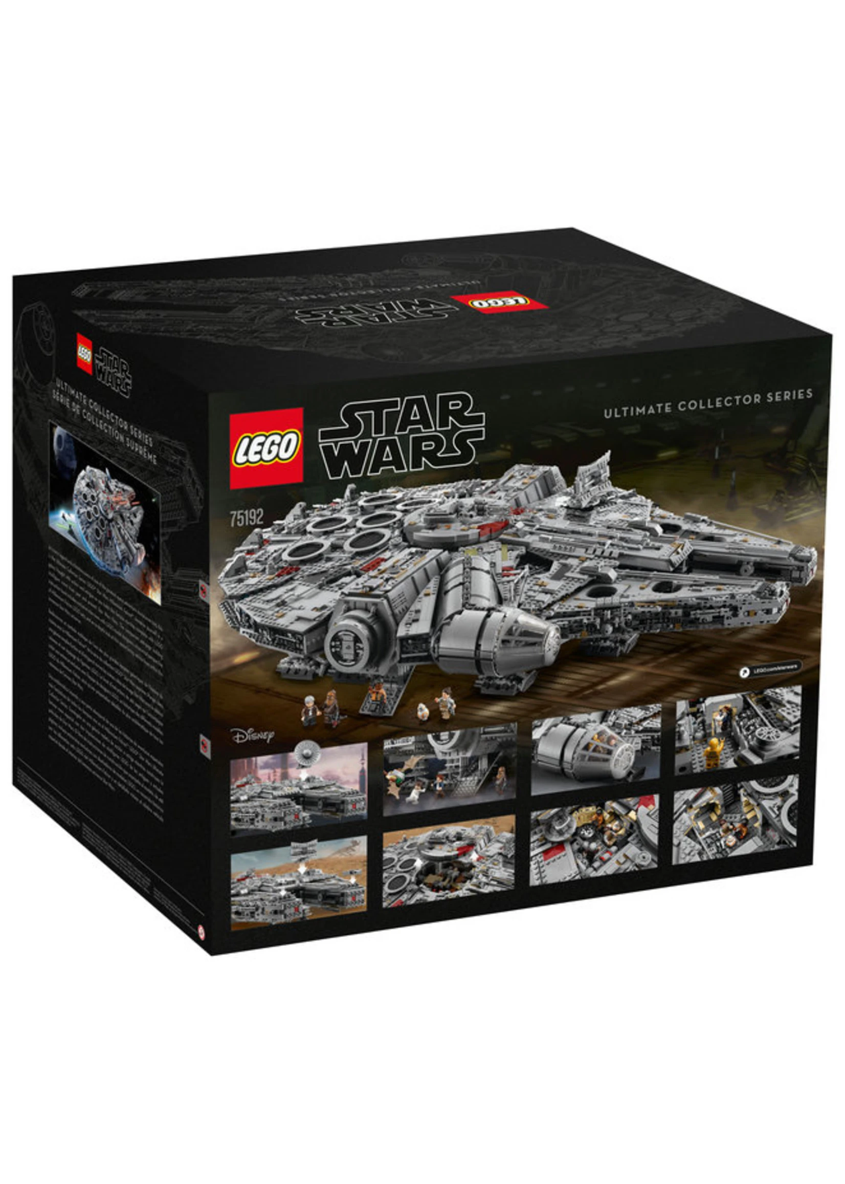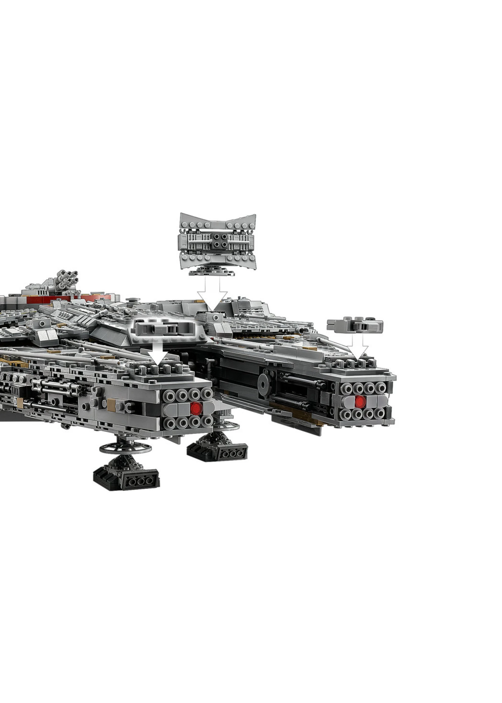 Welcome to the largest, most detailed LEGO® Star Wars Millennium Falcon model we’ve ever created—in fact, with 7,500 pieces it’s one of our biggest LEGO models, period! This amazing LEGO interpretation of Han Solo’s unforgettable Corellian freighter has all the details that Star Wars fans of any age could wish for, including intricate exterior detailing, upper and lower quad laser cannons, landing legs, lowering boarding ramp and a 4-minifigure cockpit with detachable canopy. Remove individual hull plates to reveal the highly detailed main hold, rear compartment and gunnery station. This amazing model also features interchangeable sensor dishes and crew, so you decide whether to play out classic LEGO Star Wars adventures with Han, Leia, Chewbacca and C-3PO, or enter the world of Episode VII and VIII with older Han, Rey, Finn and BB-8!