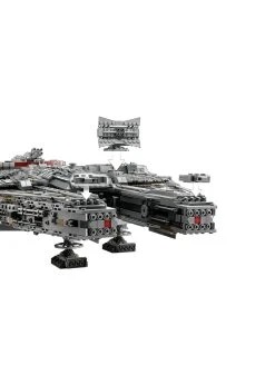 - Exterior features include intricately detailed and removable hull panels, a lowering boarding ramp, concealed blaster cannon, 4-minifigure cockpit with detachable canopy, interchangeable round/rectangular sensor dishes, upper and lower quad laser cannons, and 7 landing legs.