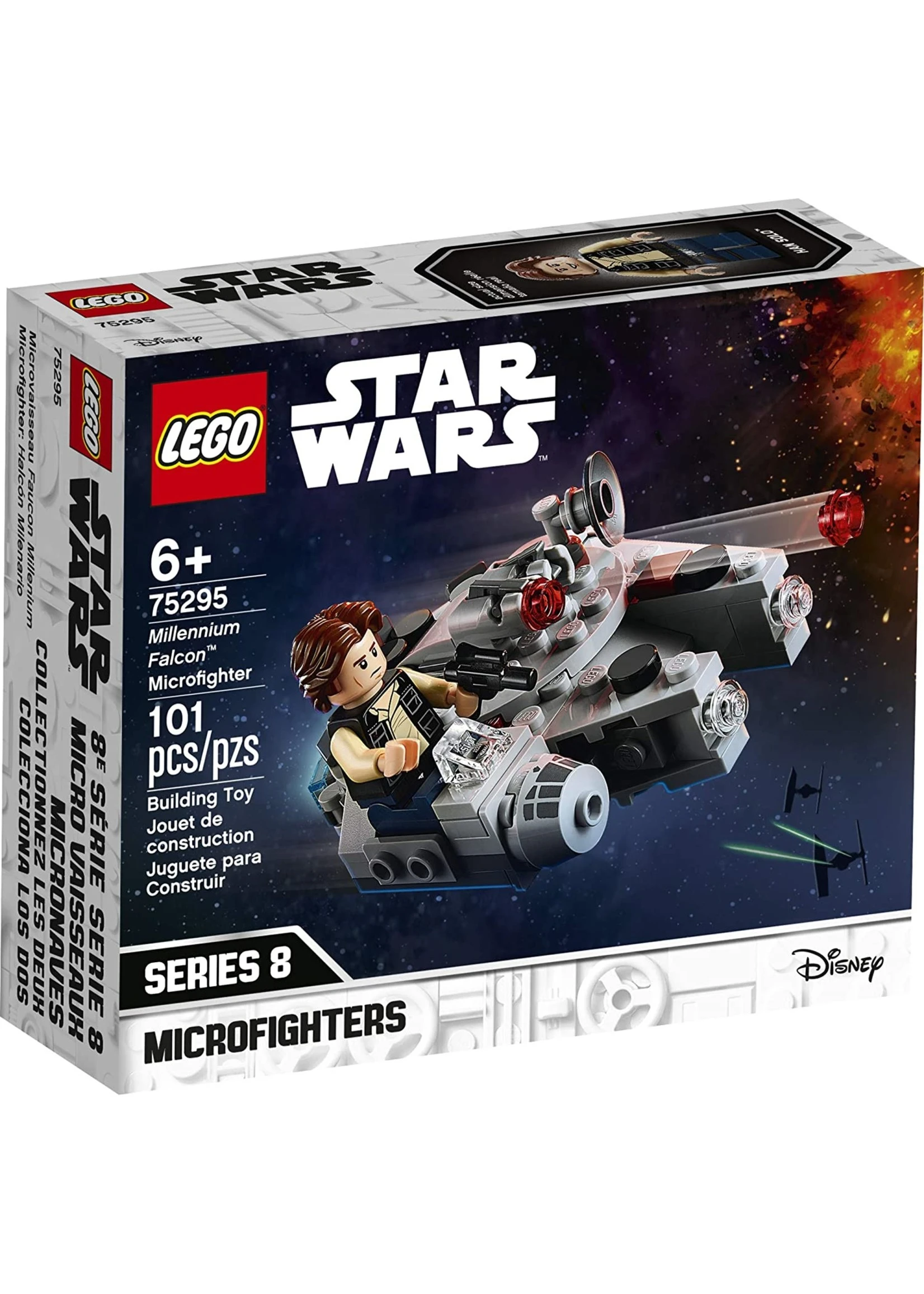 - The Millennium Falcon Microfighter (75295) features a seat for the Han Solo LEGO® minifigure and 2 stud shooters, for fun, creative play. Han Solo also has a blaster pistol.