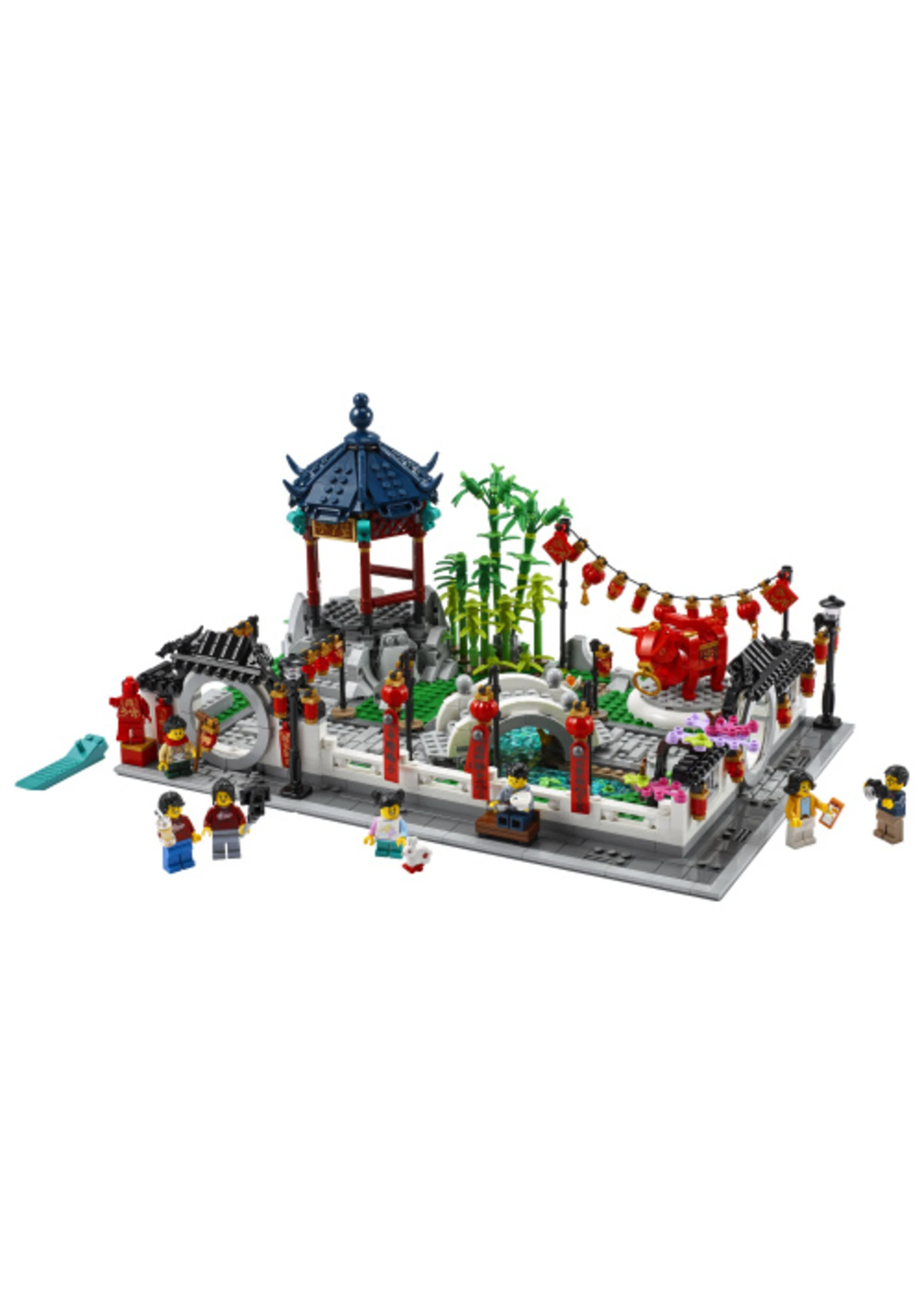 - The garden has moon gates, pavilion, bridge and pond with frog and koi fish figures, buildable bamboo trees, ox lantern with LEGO® light brick, buildable lanterns and traditional Chun Lian banners.