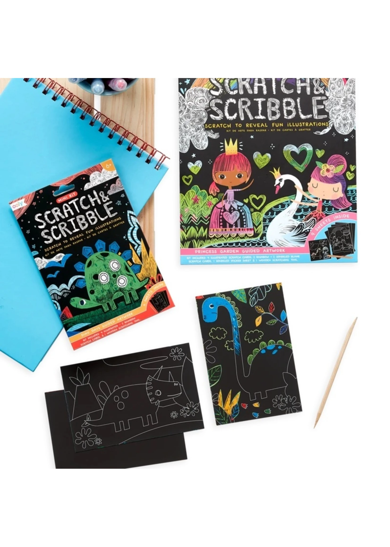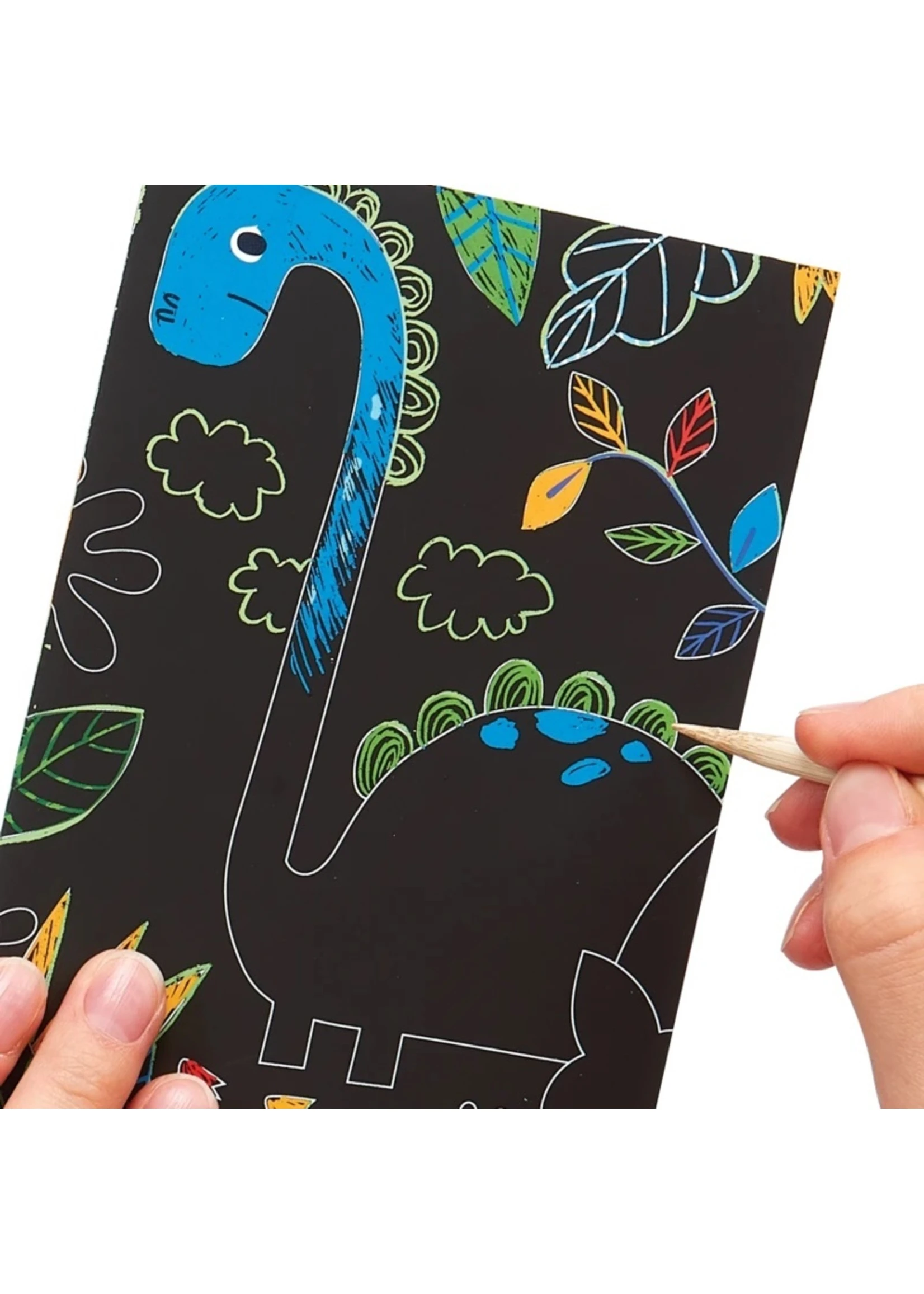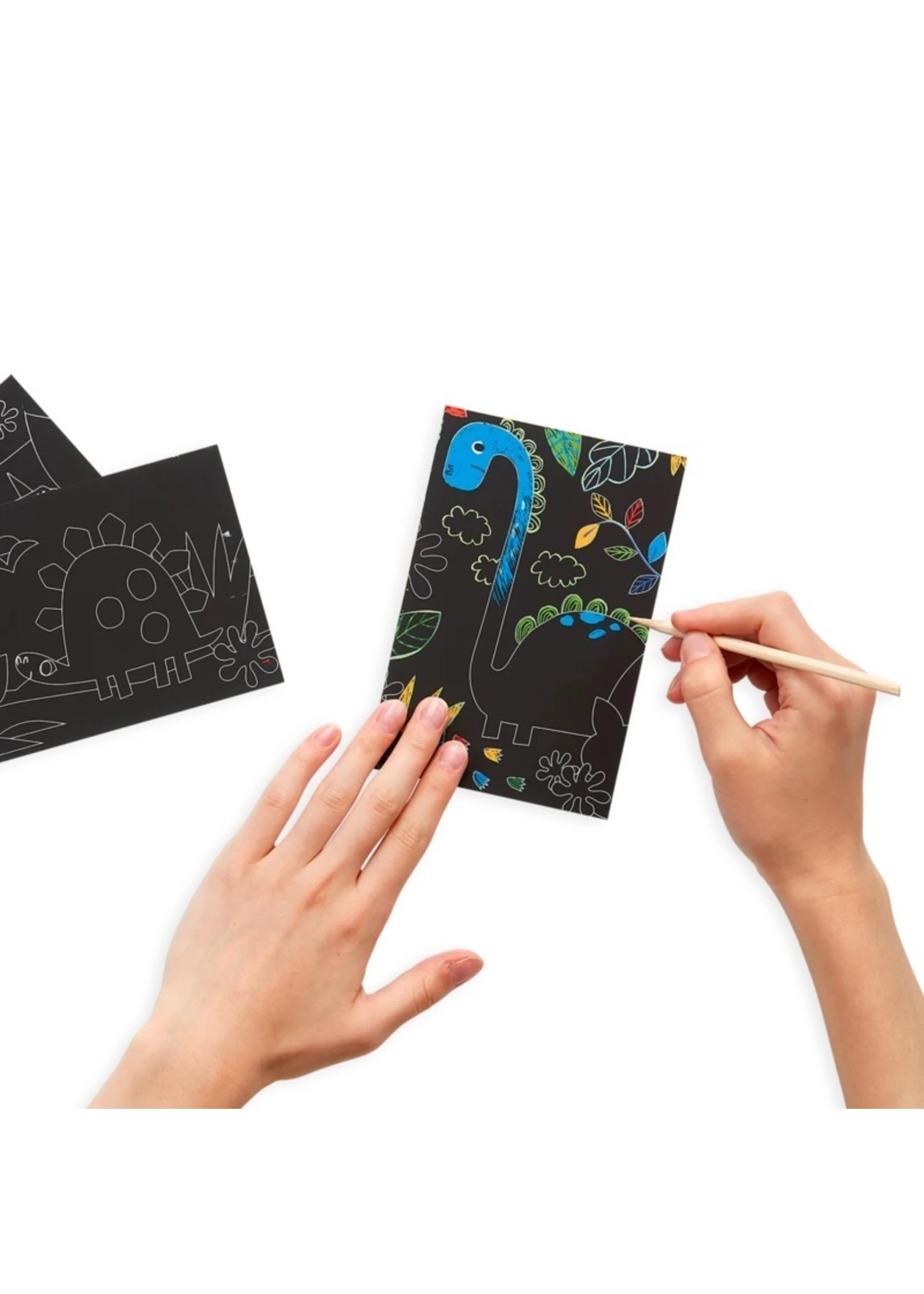 Get busy scratching because dinosaur adventures are waiting! These fun dinosaur themed scratch art cards are filled with easy-to follow guidelines to reveal the dino inspired rainbow artwork. Sized for on-the-go fun at 4 x 6 inches these mini scratch art kits for kids are great for travel. Each kit not only has 4 cute dinosaur illustrated cards but 2 blank cards for creating your own designs, all revealing a rainbow of color using the included wooden stylus.Â