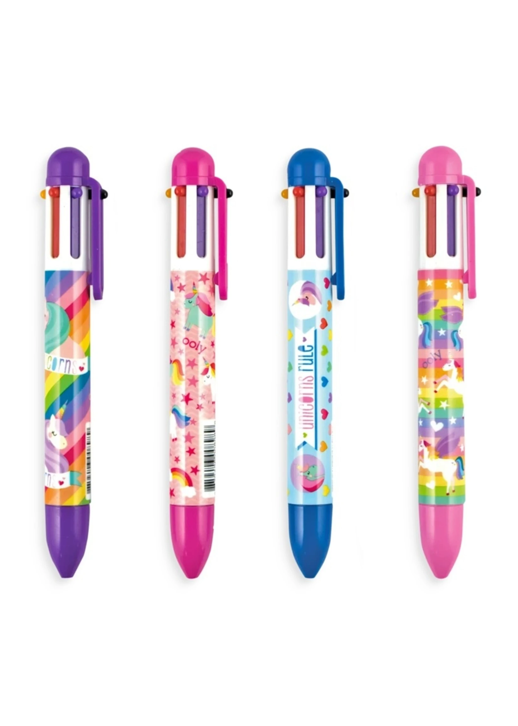 Enjoy the magical adventures of writing with this multi color pen decorated with lovely unicorns. The Unique Unicorns 6 Click Pen has six different colored inks. Just click your way from one color to the next. Colors include blue, green, yellow, red, purple and black. Your class notes will never been the same with so many different colors to choose from. There’s 4 different styles to choose from too.
