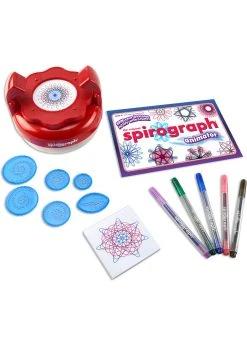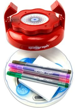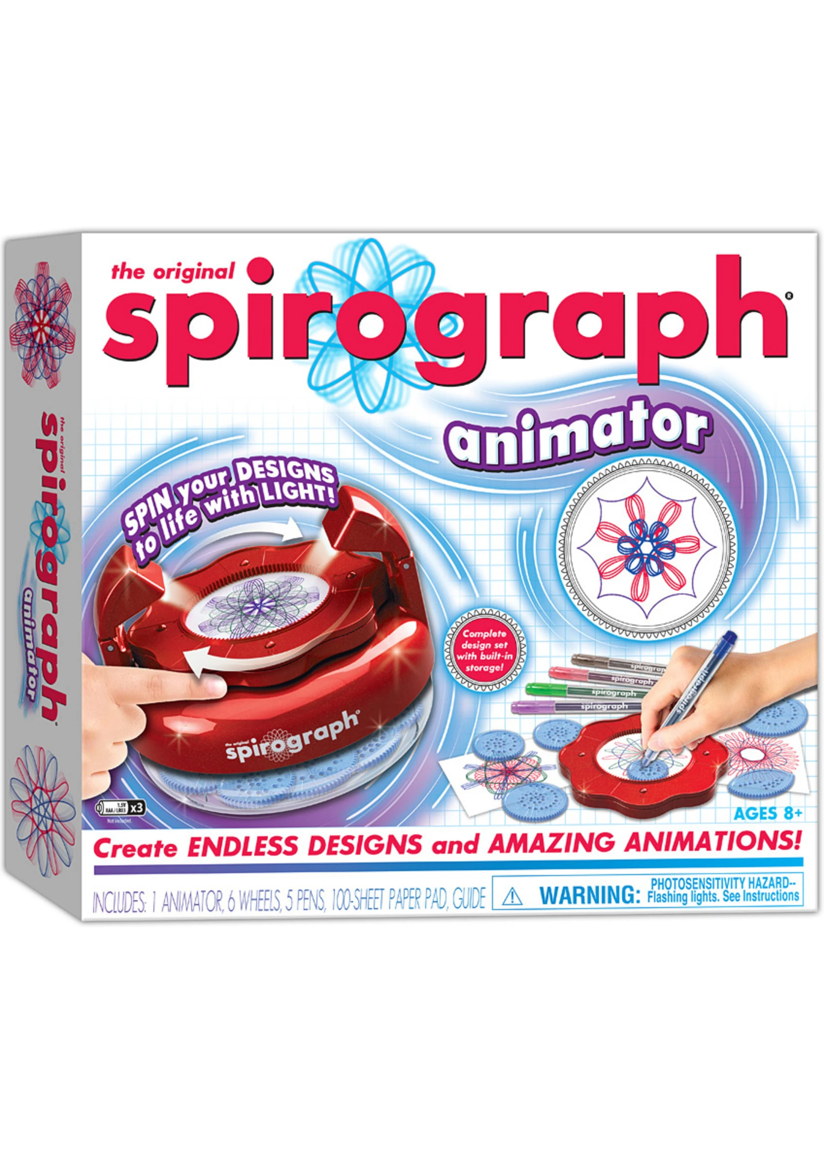 A childhood classic gets a new 3D spin with cool LED lights! The animator has a spinner platform that makes every design move in a different way with each of the rotating light effects. Additional features include a built-in storage compartment underneath and an easy-on/off button. You’ll also get 6 wheels, 5 fine-line pens, a 100-sheet pad and of course an instruction guide, so start swirling! Compatible with other Spirograph sets. Requires 3 AAA batteries, not included.