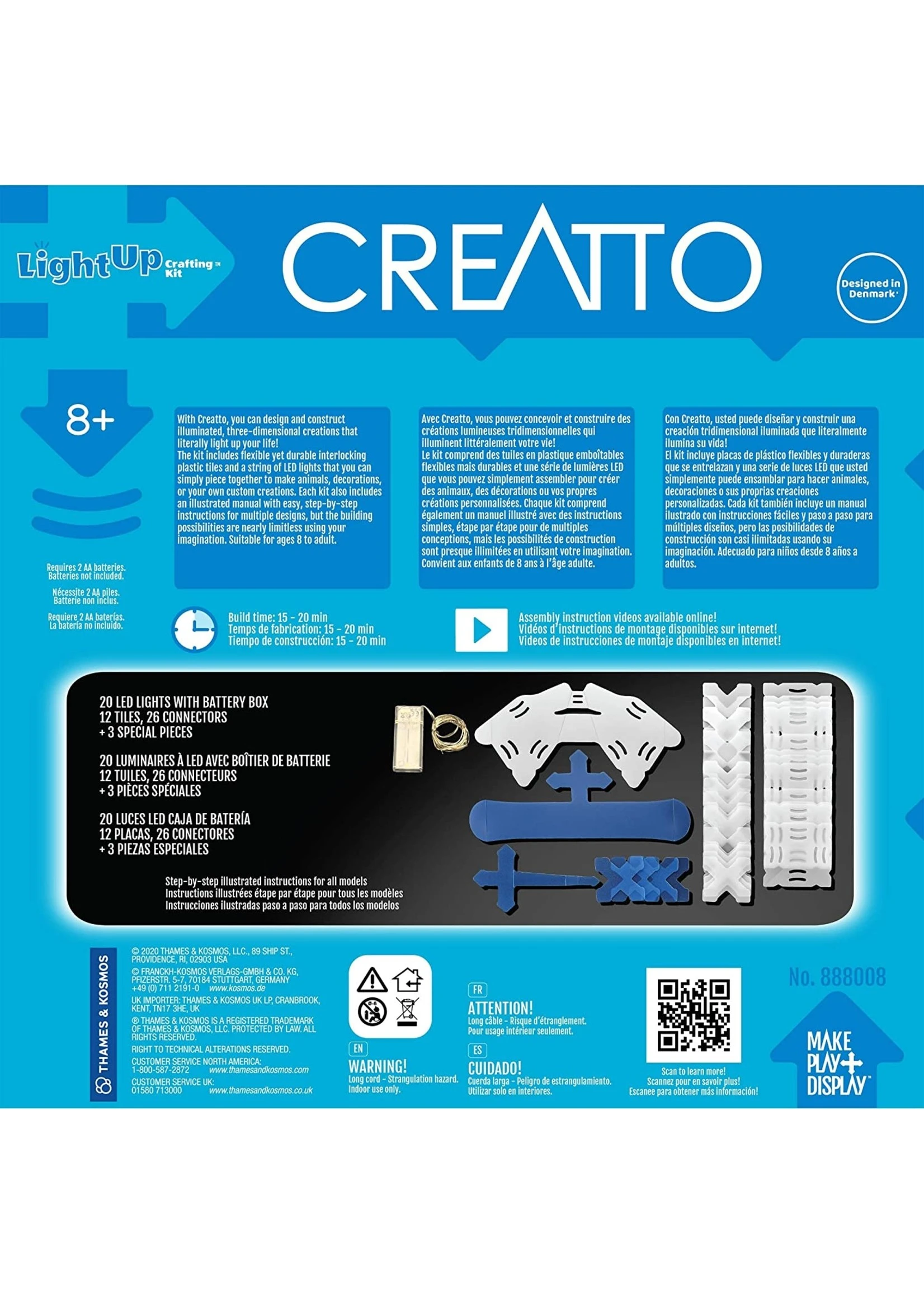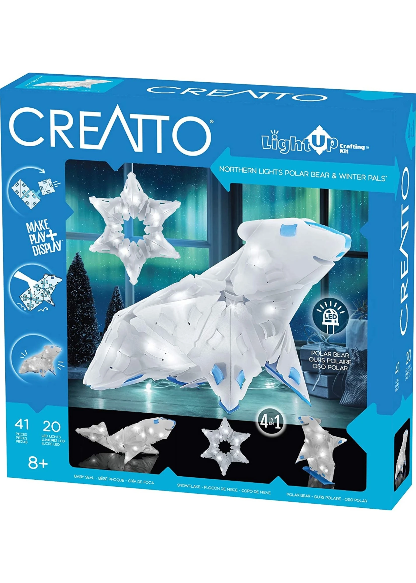 Creattoâ„¢ is a simple yet versatile building system that consists of just two primary components that can be woven together into countless 3D creations. The flexible yet durable plastic tiles interlock quickly and easily for all skill levels; no additional materials or hardware required! Northern Lights Polar Bear & Winter Pals includes 41 Creatto pieces, a string of 20 LED lights, and assembly instructions to build a polar bear, baby seal, snowflake, and a funny snowboarding polar bear. Battery-powered lights require 2 AA batteries. Suitable for ages 8 and up.